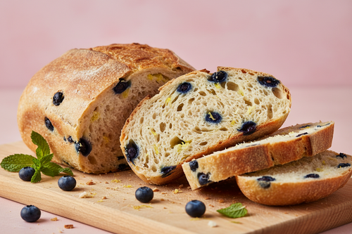Our Blueberry & Lemon Sourdough Bread is a bright, refreshing artisan loaf that pairs the natural tang of slow-fermented sourdough with bursts of juicy blueberries and the zesty aroma of fresh lemon. Handcrafted in small batches, each loaf is naturally leavened and patiently fermented to develop a light, airy crumb and a beautifully crisp crust.